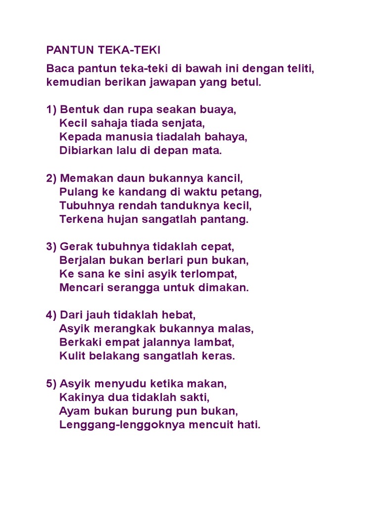 Apr 23 2021 Teka Teki dan Jawapan. Makna pantun teka-teki adalah pantun yang isinya berupa teka-teki dan bisa digolongkan sebagai salah jenis permainan dalam karya sastra. 59857491 Komsas Tingkatan 1.