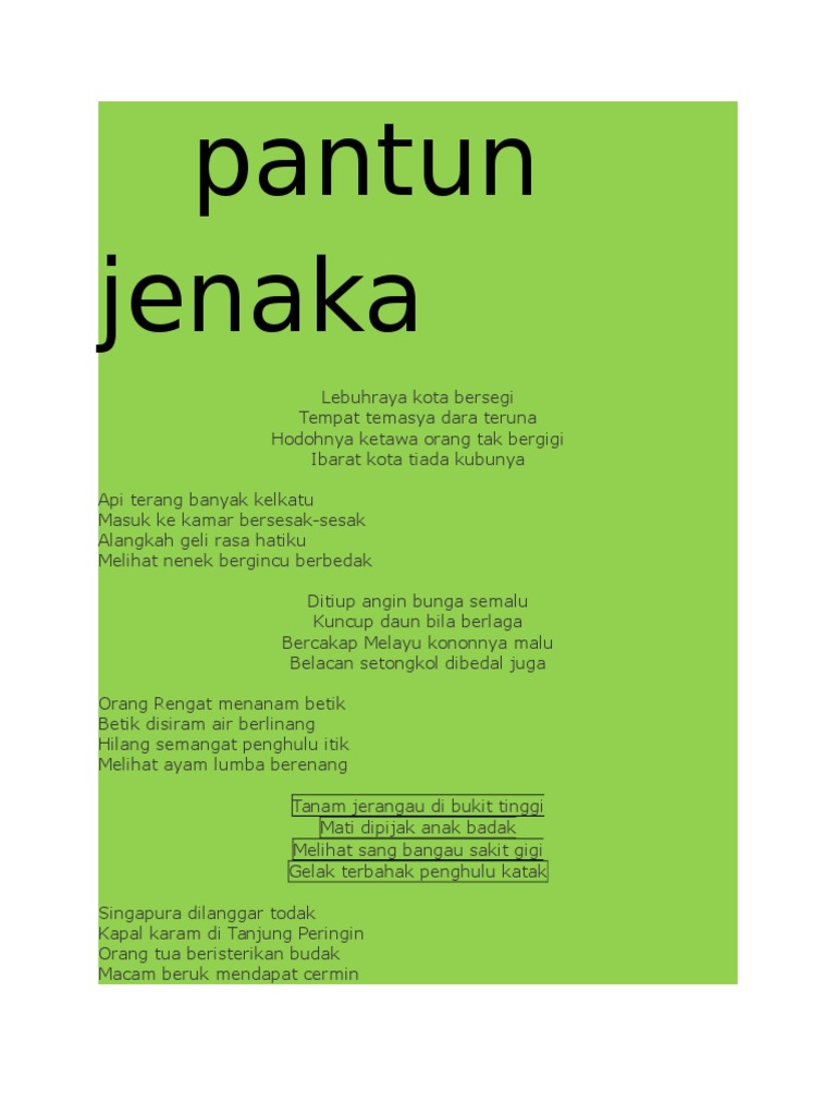 Arsip cerita lucu dan humor kategori Lawak Melayu Jenaka berisi gambar lucu sms lucu teka-teki lucu jokes ngakak ketawa-ketiwi gurauan jenaka guyonan dagelan. Pantun jenaka dan permainan 5. Pantun adalah bentuk puisi Indonesia di mana tiap bait biasanya terdiri atas empat baris yang bersajak.